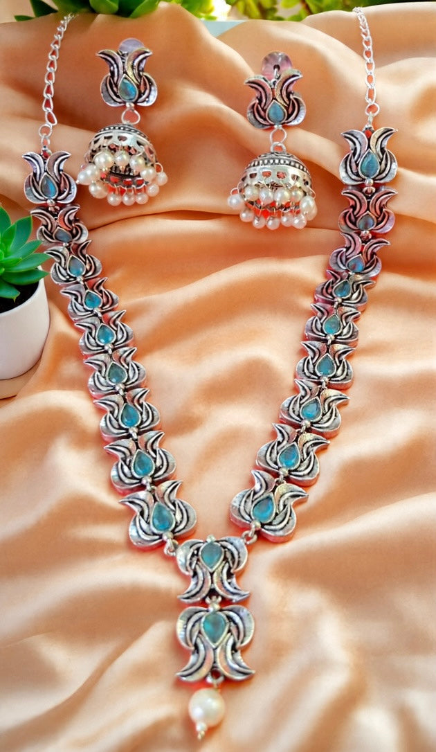 The Aqua Vistara Set features an elegant oxidized necklace adorned with floral-inspired aqua motifs, paired with matching earrings accented with pearls. A graceful fusion of tradition and style, perfect for festive wear and special occasions.