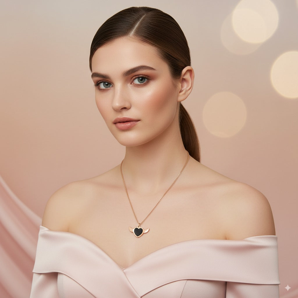 Elevate your style with the Midnight Wings Necklace, a stunning blend of elegance and symbolism. Featuring a glossy black heart embraced by golden wings, this pendant represents strength, love, and freedom. Crafted from premium stainless steel with an anti-tarnish finish, it ensures long-lasting shine and durability. The sleek golden chain adds a touch of sophistication, making it a versatile piece for both everyday wear and special occasions.